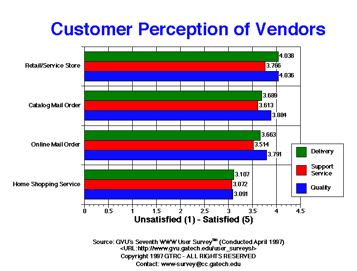 - For this question, users were asked to rate their satisfaction of delivery, support services, and quality of different types of vendors. Higher scores indicate increased satisfaction. The most preferred for all characteristics (delivery, support service, and quality) is retail or service stores. This is closely followed by catalog mail order and online mail order with very little difference between the two. These three types of vendors scored between 3.5 and 4.0 on a five-point scale for all three characteristics. Home shopping services were the least preferred and received a neutral response (3.0) for all three characteristics.