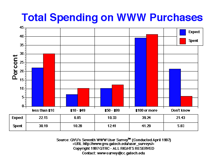 - Over 40% of respondents report spending over $100 in purchases over the web in the past six months. This percentage is up considerably from the Sixth survey where only 30% had spent this much. Also, only 31% predicted that they would spend over $100 six months ago. The slow trend toward increased spending on the web shown by this and other surveys should be encouraging to web vendors, but it should be interpreted with caution. For all categories of spending, respondents predict that they will spend less in the next six months than they have in the previous six months. The increased spending seen with this survey may reflect the seasonal (Christmas/Hanukkah) fluctuations which are common in retail sales.