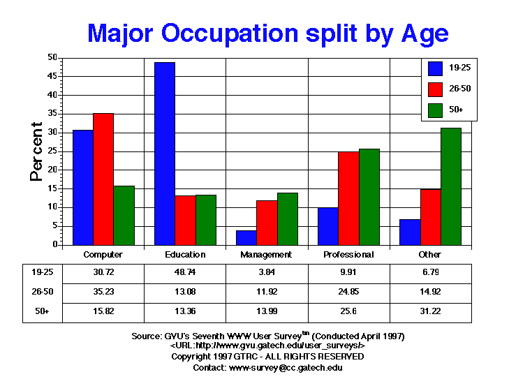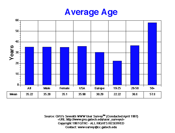 - The average age of users responding to the Seventh survey is 35.2 years old. The average age of users in our surveys has been slowly but steadily increasing since the Fourth survey at roughly one year per survey (Fourth: 32.7 yr., Fifth: 33.0 yr., Sixth : 34.9 yr.). The average age reported in this Survey is within the margin of error reported by FIND/SVP's 1997 American Internet User Survey of 36.5 yr. old. The consensus on average age between our data, collected through the pioneering method of using the Web to collect data, and FIND/SVP's data, collected through the traditional method of random telephone calls, helps increase our confidence that the core demographics in the Seventh Survey are representative.