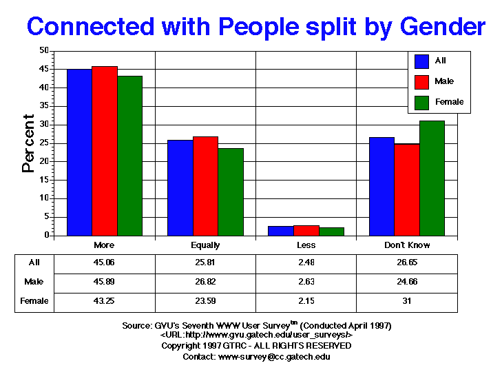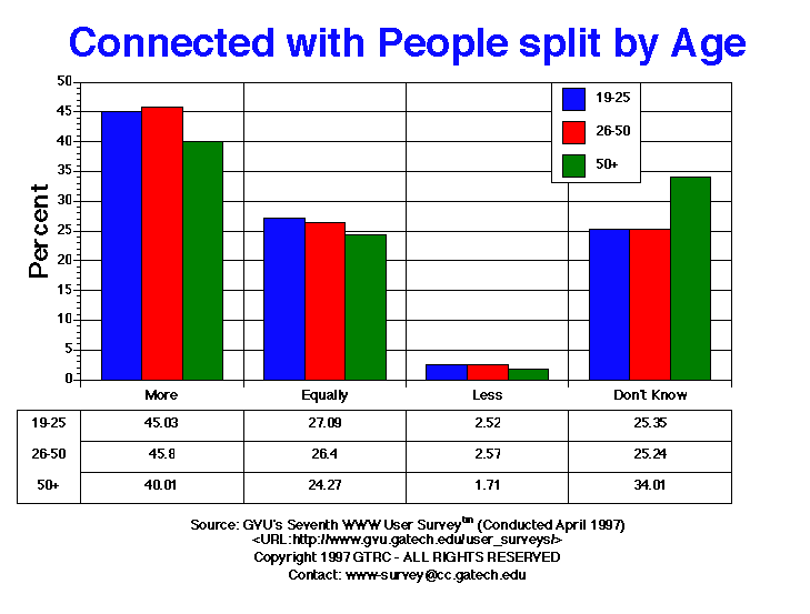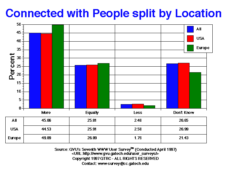 - As with the Sixth Survey, almost half (45.06% Seventh vs. 46.1% Sixth) of the respondents felt more connected to people who share their interests since coming online. Only 2.48% report feeling less connected, although a quarter of the respondents (26.65%) state that they do not know. The other 25.81% report feeling equally connected since going online. This provides some evidence for the claim that the Internet is more than just an information resource, rather it is building new communities based on common interests.