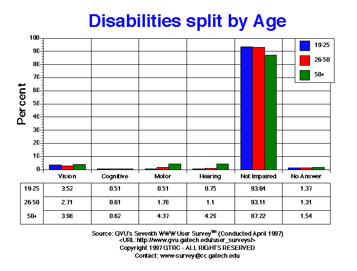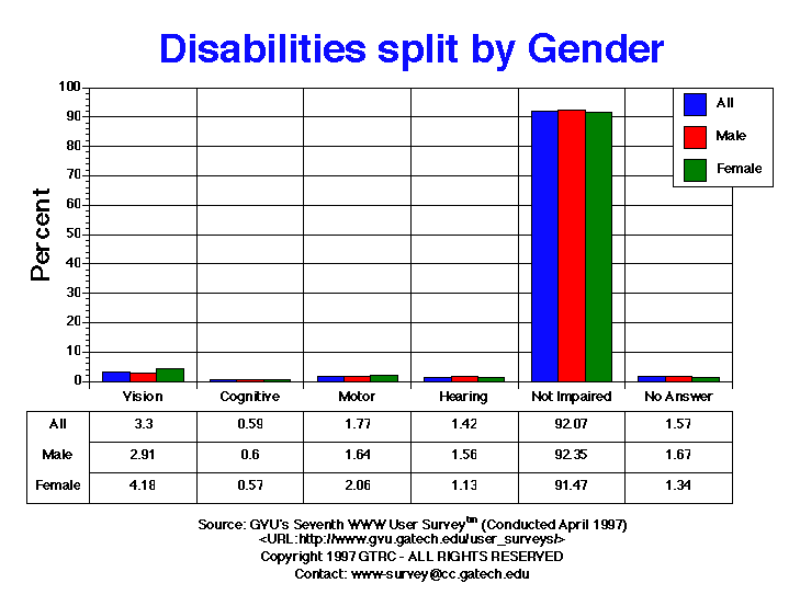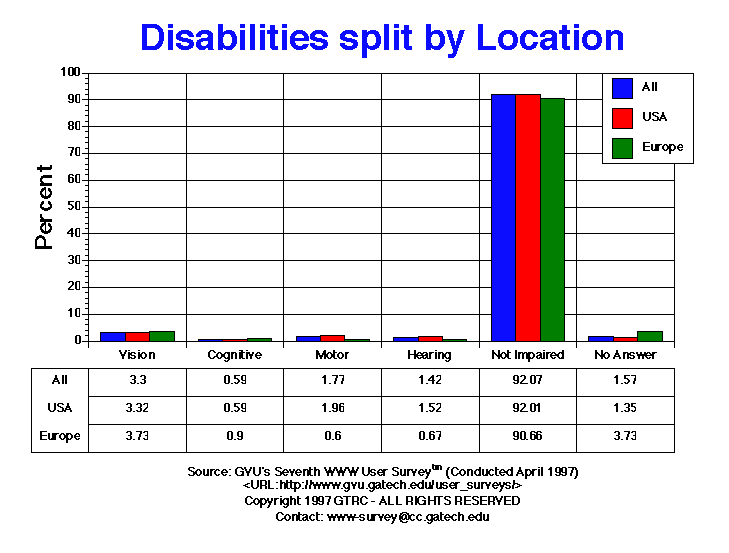 - Our current mindset is to ask respondents about disabilities on every other survey (yearly). This is due to the stability of this demographic characteristic. Since the Web does not easily facilitate access by users with disabilities, it is not surprising that 92.07% of the users do not report any disabilities. Impaired vision is the most widely reported disability, but still only accounted for 3.3% of the responses. The other disabilities were each repo rted by less than 2% of the respondents.