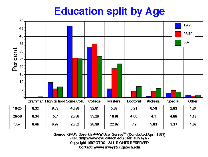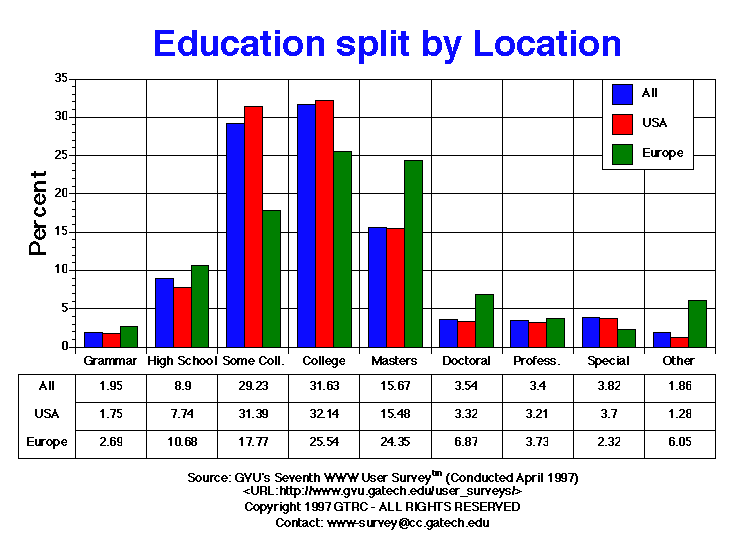 - The distribution of educational attainment has been virtually unchanged since the Fourth survey. For the Seventh Survey, 54.24% of respondents have completed a college or advanced degree. (This percentage was 56.1% for the Sixth Survey). European respondents continue to report higher levels of educational attainment than US respondents. Commercial Internet service providers are not as wide spread in Europe as they are in the US; as a result, many European users access the Web as a result of their affiliation with a univer sity.