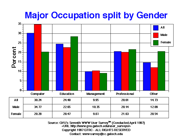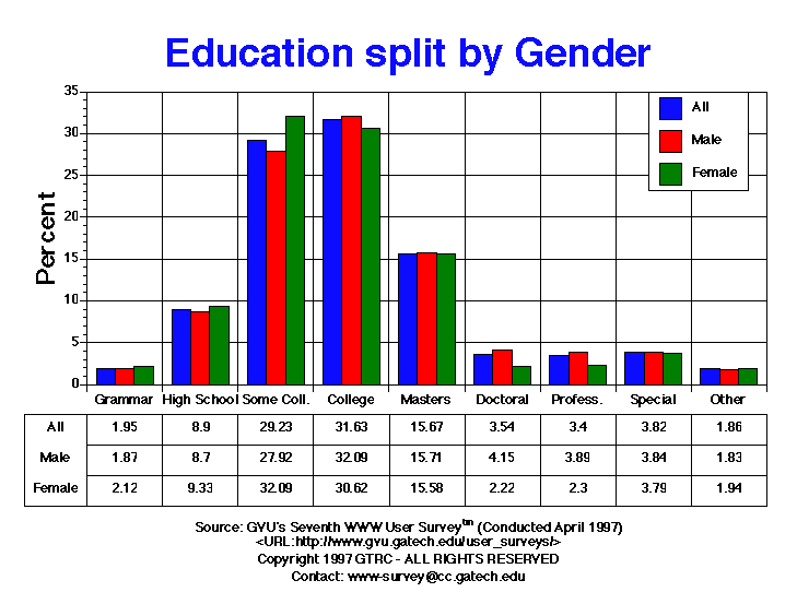 - The proportion of female users in the US has always been an interesting statistic to the popular media. Some research firms report the proportion of female users to be in the 40% range, while others (such as our Surveys and FIND/SVP's 1997 American Internet User Survey) report the proportion to be in the low to mid 30% range (GVU 7: 33.41% vs. FIND/SVP: 35.9%). Much of the difference between results can be explained by inspecting the definition of a user and possible age limitations placed upon the users. Our numbers, by the very nature of our sampling method, represent active Web users, whereas other numbers may more accurately reflect very casual users (i.e., they have used the Internet at least once in the past 6 months, etc.). Thus, neither number is necessarily wrong or better than the other in our opinion. We do recommend using a variety of research sources when making decisions based upon demographics.