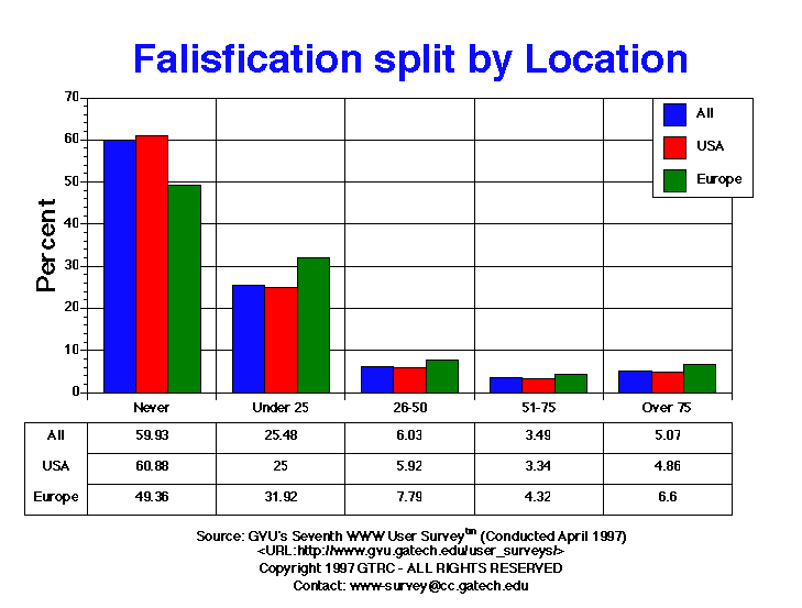 - For the Seventh Survey, 59.93% of respondents said they had never provided false information to a site when registering (compared to 63.1% on the Sixth Survey). This means that approximately 40% of respondents have provided false information. A total of 14.59% of users report falsifying information over 25% of the time--a disturbing number if you are trying to make the claim that the collected demographics of a site's online registered users are representative of the entire set of users for that site.