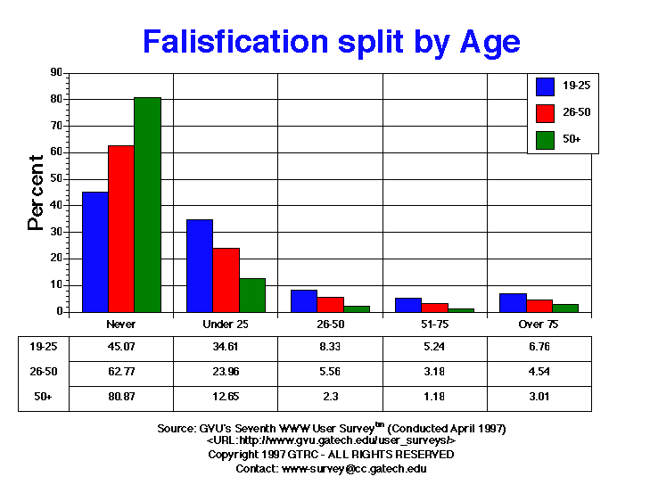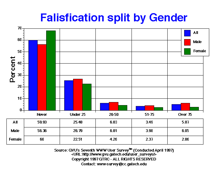 - A larger percentage of females than males report never having falsified information (68.00% of females vs. 56.35% of males). Also, the likelihood of having provided false information decreases with age. Both of these trends were also found in the Sixth Survey.