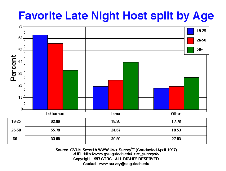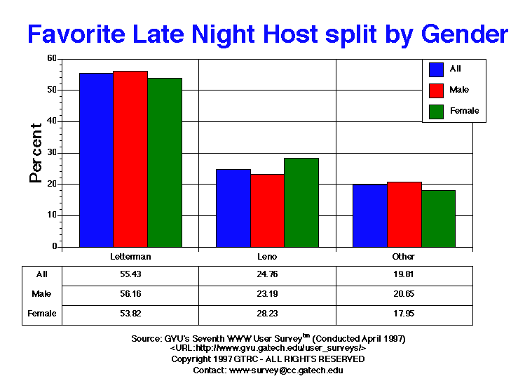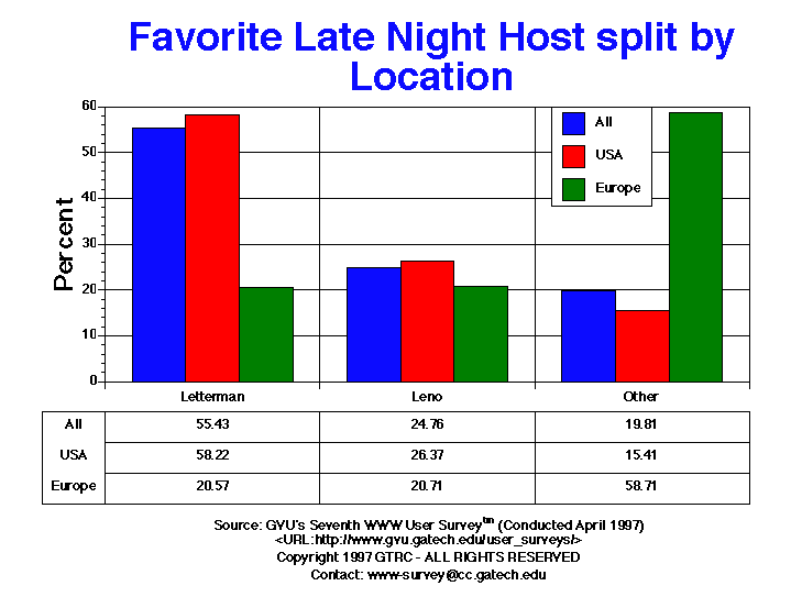 - Of those respondents that stated a late night talk show host preference, Letterman was chosen over Leno more than 2 to 1 (55.43% Letterman vs. 24.76% Leno). A large percentage of European users had a favorite host other than Letterman or Leno. This is not surprising, since both of these hosts are from the US. A higher percentage of women than men preferred Leno (28.23% female vs. 23.189% male). Younger users, though, tended to prefer Letterman, with older users preferring Leno. All of these trends are consistent with results from the Sixth Survey.