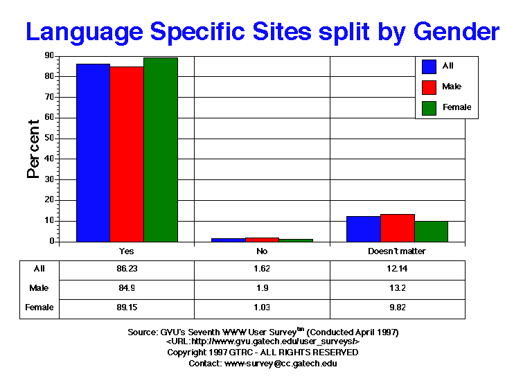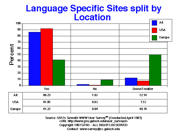 - This is a new question to the Seventh Survey, which asked: "Do you prefer to access web sites in your first (native) language?" This question reveal a major geographical difference, with 91.85% of the US users stating that they prefer sites in their first language (English), with only 41.22% of the European users sharing the same preference. The majority of European users report that it does not matter (49.74%). One possible reason for this result is that Europeans tend to be multi-lingual, whereas their US counterparts tend to mainly speak English. Younger users do not feel that the language of the site matters as much as older users (16.84% 19-25 yre. old vs 6.66% 50+ yr. old).