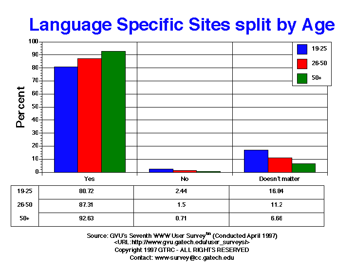 - This is a new question to the Seventh Survey, which asked "Do you think that having more web sites which are tailored to your language and culture will make people in your country more willing to use the web?" Roughly a fourth of the respondents are unsure (23.74%), with 59.42% saying "Yes" and the remaining 16.84% saying "No". Over two thirds of the European user feel that more language specific sites would facilitate Web growth in their coutnry (70.95% Eurpore vs. 58.04% US). Additionally, European users were more likley to take a postion on the issue, with only 13.52% stating that they did not know (25.24% US). Age factors into this question, with the younger users feeling that more languages would help (62.3% 19-25 yr. olds) than older users (52.04% 50+ yr. olds).