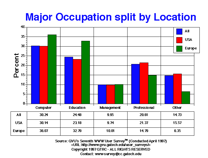 - Nearly a third of the users (30.24%) report being in a Computer related field, with 24.48% being in Education, 20.61% Professional, 14.73% Other and 9.95% Management. European users were more likely to be in Computers or Education than their US counterparts. Women are less likely as men to be in Computer related fields (20.28% Female vs. 34.77% Male), but are equally likely to be in Management or Professional positions. Almost half of those age 19-25 are in Education (48.74%) (which includes being a student). Those aged 26-50 (35.23%) are more likely to be in Computer fields than any other age group