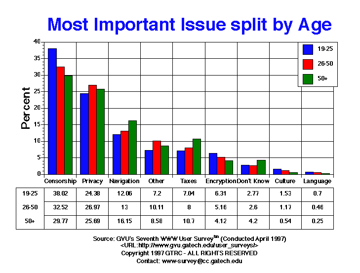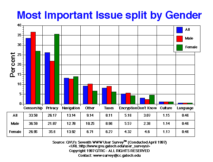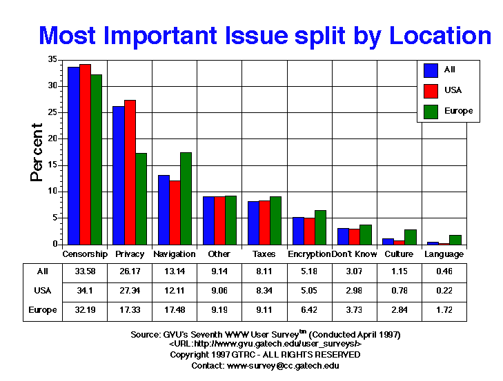 - Keeping in line with the Sixth Survey, the largest category of respondents (33.58% Seventh vs. 35.9% Sixth) feel that censorship is the most important issue facing the Internet today. This is followed by privacy (26.17% Seventh vs. 26.2% Sixth) and navigation (13.14% Seventh vs. 14.1% Sixth). The issues that are the least cited as most important are cultural and language issues, each receiving under 2% of the responses. Among European respondents, navigation outranks privacy as the second most important issue. And among women, privacy outranks censorship as the most important issue. Although the top 3 concerns have the same relative ranking for each age group (censorship, privacy, navigation), younger people are far more concerned with censorship than older users.
