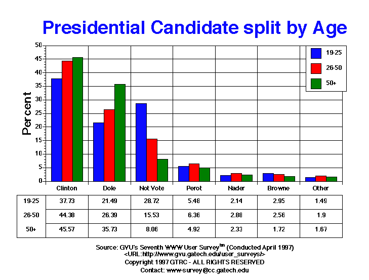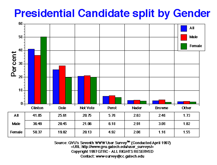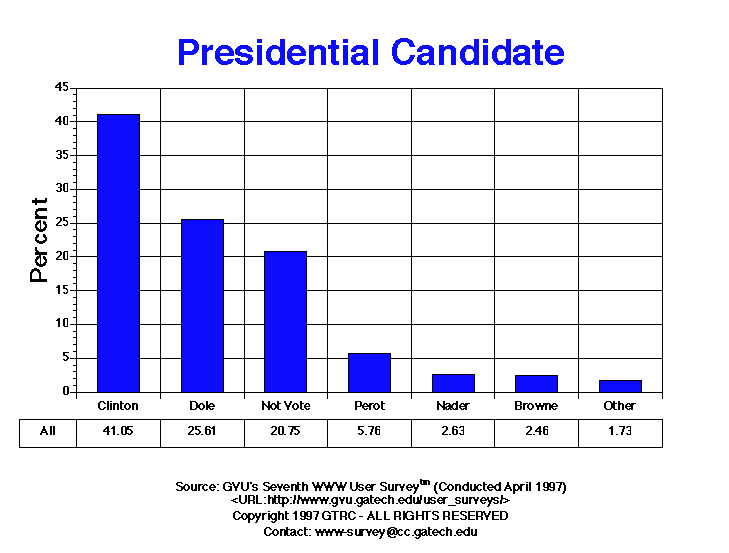 - We asked this question nearly six months after the US Presidential elections to test the stability of our sample. Clinton was voted for by 41.05% of the users (43.0% claimed they would vote for Clinton in the Sixth Survey in October 1996). Dole received 25.61% of the responses (27.5% in the Sixth Survey). For both candidates, the Seventh Survey retrospective behavior differed from the Sixth Survey behavior by two percentage points. If we consider only those respondents who chose one of the three major candidates, the percentages are: 56.7% for Clinton, 35.4% for Dole, and 8.0% for Perot. These percentages fall within the margin of error for CNN/USA Today/Gallup Polls conducted during the same period. These findings increase our confidence in the representativeness of the sample for the Seventh Survey.