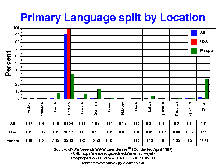 - The vast majority (91.84% Seventh vs. 93% Sixth) reported that English was their primary language. This is a sustained increase from the Fifth survey (88.6%). For European respondents, 13.73% use German (up from 10.9% Sixth) and 6.83% use French (up from 3.6% Sixth) as their primary language. 27.76% said that they use a language which was not listed as one of our choices. Female and older users are more likely to report English as their primary language.