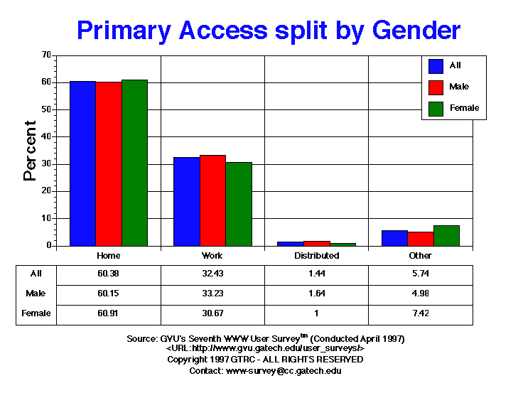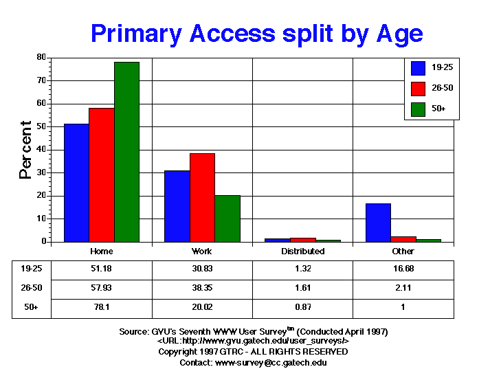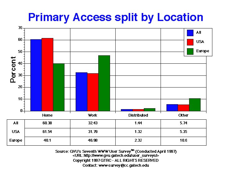 - As with the Sixth and Fifth Surveys, the majority of respondents report that they primarily access the web from home, though there was an increase six months ago from the Fifth to the Sixth Surveys (60.38% Seventh vs. 63.6% Sixth vs. 55.40% Fifth). In Europe, however, only 40.10% (36.7% Sixth) report having their primary access from home (46.98% report having it from work). Across all age groups, most access the web primarily from home, but that is especially true for users over age 50 (78.1%). There are no observable gender differences.