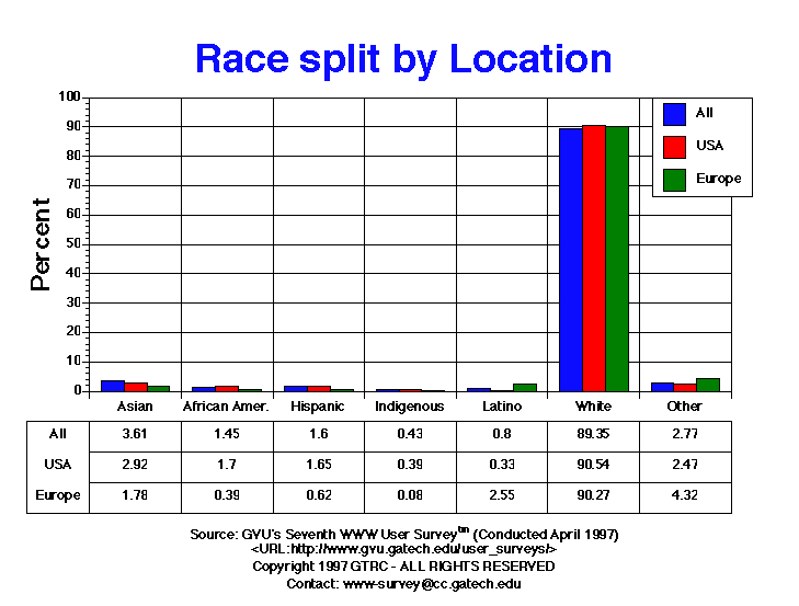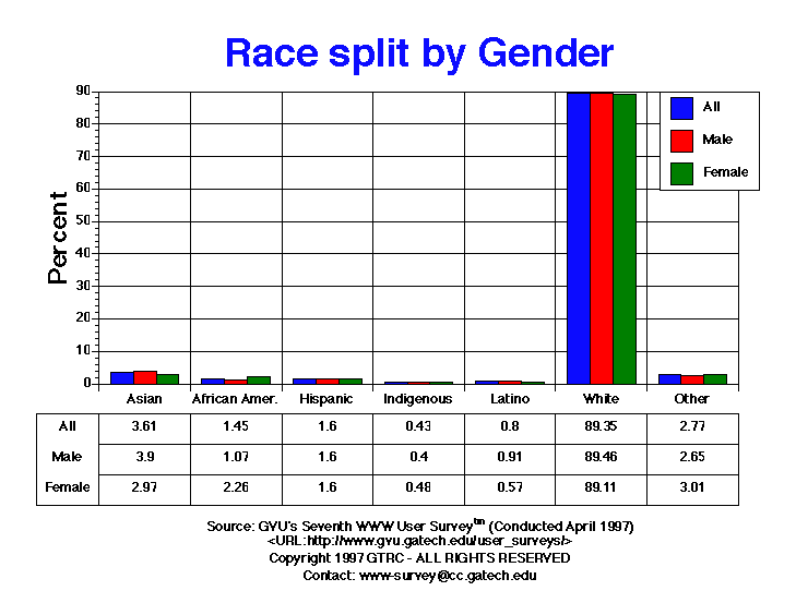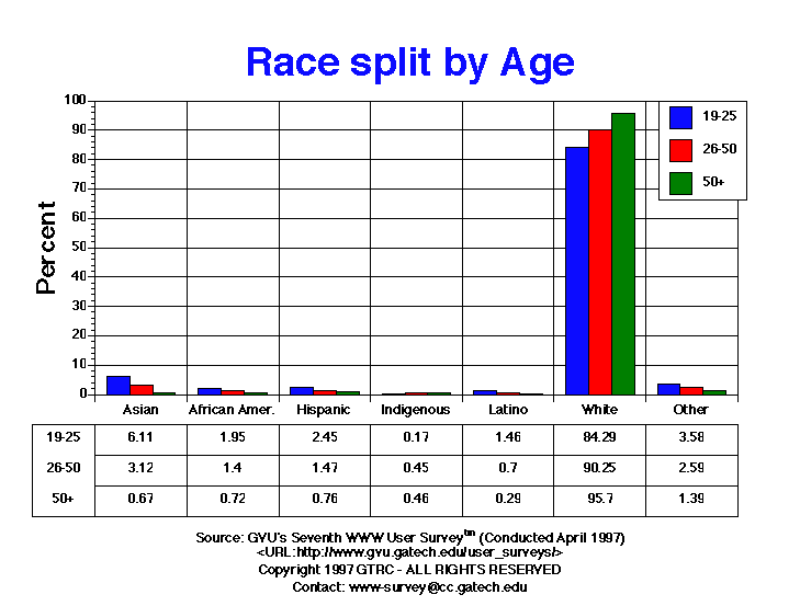 - The majority of respondents identified themselves as "Caucasian/White" (89.35% Seventh vs. 88.1% Sixth) which is nearly identical to the Fifth survey. There are no differences for race with respect to gender. 6.11% of those aged 19-25 identified themselves as "Asian", with 95.70% of the older users reporting being " Caucasian/White."