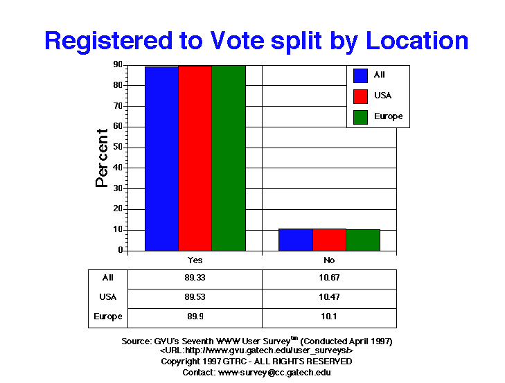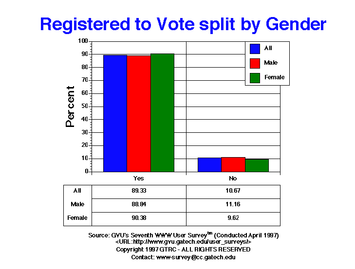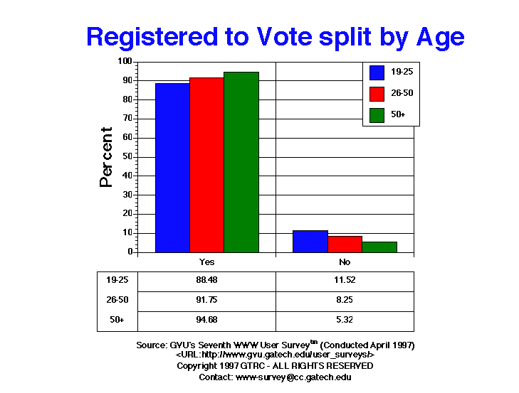- As initially flushed out in the Surveys conducted in 1996, the Web remains a very viable political medium, with 89.33% of respondents reporting that they were registered to vote, a level which has remained very stable (88.8% Sixth, 91.9% Fifth). As one might expect, older respondents are more likely to be registered than younger respondents.