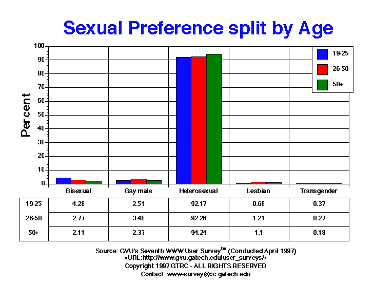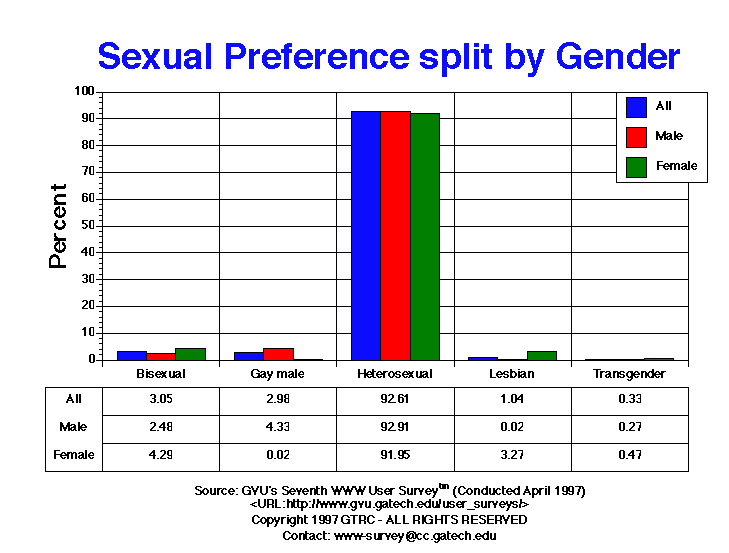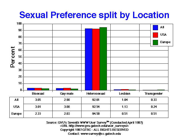 - This is the first time we asked users to tell us about their sexual preference. Of those users who responded, 92.61% stated that they are heterosexual. This corresponds roughly to the proportions reported in urban US surveys. Out of the other choices, 3.05% reported being bisexual, 4.33% gay males, 3.27% lesbian, and 0.33 transgender. (Note, the "gay male" and "lesbian" responses would each be selected by a single gender, whereas the other categories could be selected by both genders.) There were no major differences between European and US users. More females reported being bisexual than their male counterparts (4.29% female vs. 2.48% male).