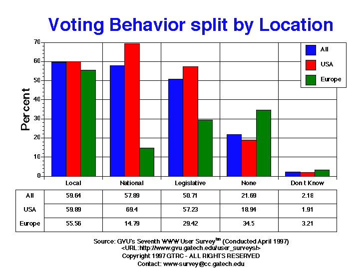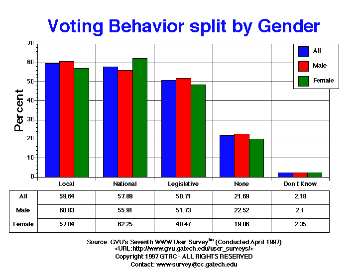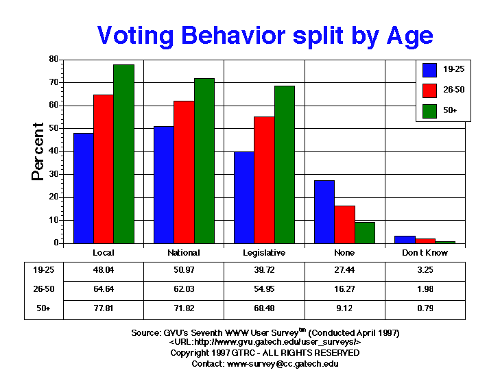 - This question was only asked of those who said they were registered to vote. Of those registered, 50-60% voted in the most recent local (59.64%), national (57.89%), and legislative (50.71%) elections. Age plays a direct role in voting behavior, as older users are more likely to have voted in local, national, and legislative elections. Over one quarter of the 19-25 yr. old respondents (27.44%) report not voting in any elections. No major gender differences were observed.