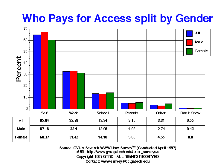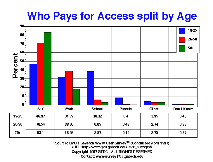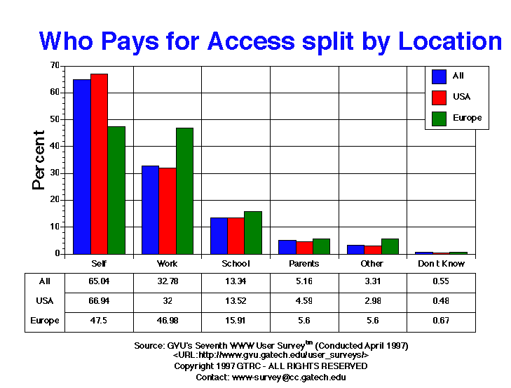 - For this question, respondents could choose more than one answer. The same proportion of respondents report paying for their own Internet access as in the Sixth Survey (65.04% Seventh vs. 66.62% Sixth ). The trend prior to the Sixth though was one of increasing self-payment for Internet services (57.7% Fifth vs. 51.0% Fourth). This is followed by having it paid for by work (Seventh: 32.78%, Sixth: 28.76%). This supports the notion that Internet access is becoming a personal resource and not a heavily governmental and educational subsidized resource. Compared to respondents from the US, European users typically have their access to the Internet paid for by work (46.98% Europe vs. 32.00% US) rather than by themselves (47.50% Europe vs. 66.94% US). Older users are more likely to pay for access themselves (83.10%) and the 19-25 yr. old segment is more likely to have school pay for access (38.32%).