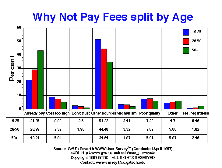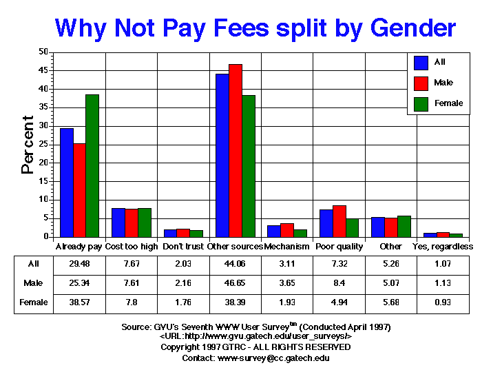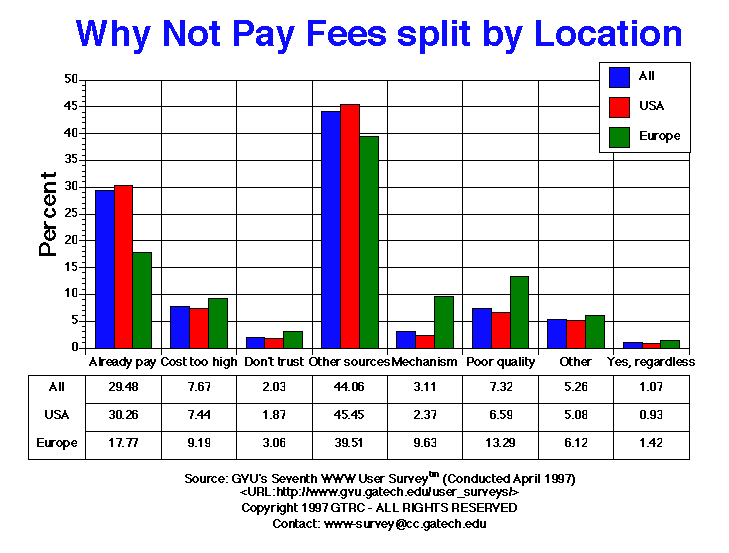 - In past surveys, we have asked whether people would be willing to pay fees to access sites. Typically, over 2/3 of the respondents claimed that they would not pay fees. In order to help figure out why, we repositioned this question to get at the reasons people would not pay to access Web sites. Almost half of the respondents cited being able to access the content on other sites as the main reason (44.06%). Next in line, people feel that they are already paying to access the Web via connectivity charges, so why should they pay to access specific sites (29.48%). Other popular reasons include costs too much to access (7.67%) and the content is of poor quality (7.32%). Only 1.07% state that they would pay regardless.