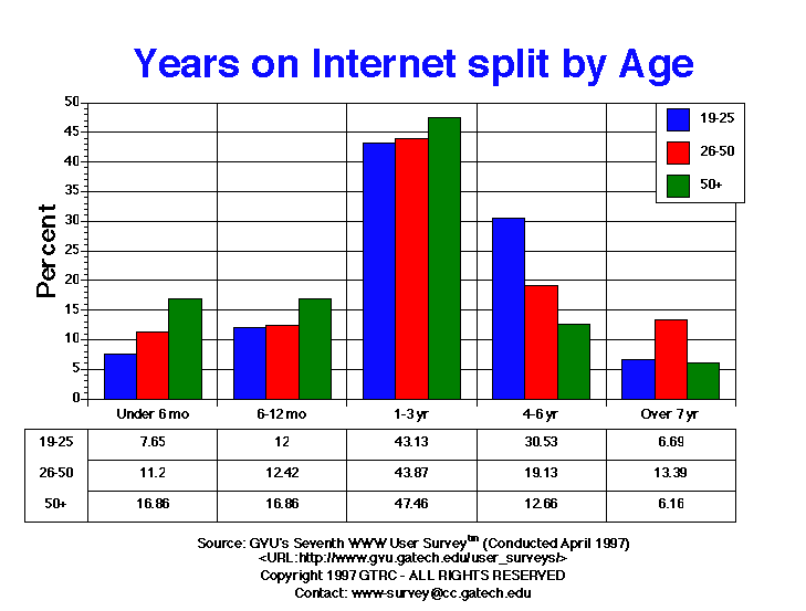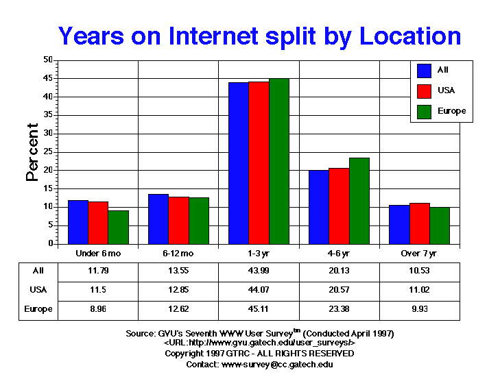 - The continued migration of users to the Internet is still seen in the Seventh Survey, where 25.34% of the users have gone online in the past year. Even though this represents one out of every four respondents, it is much less than the 36.11% observed in the Sixth Survey (October 1996), the 43.1% in the Fifth Survey (April 1996), 60.3% in the Fourth (Oct 1995), and 50.21% in the Third (April 1995). Close to half of the users have now been online between 1 and 3 years (43.99% Seventh vs. 42.44% Sixth). Nearly one in five users (20.13%) joined the Internet between April 1991 and April 1994, which represents a significant increase from the Sixth survey where only 14.31% of the users had been on the Internet between 4 and 6 years. Just over 10% of the users in the Seventh Survey have been on the Internet over 7 years, compared to 7.14% in the Sixth Survey.