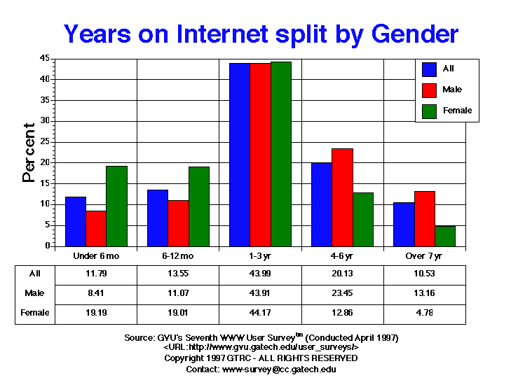 - Female users still are flocking to the Internet, with 38.20% having gone online in the past year, compared to only 19.48% for males. This is down significantly from the Sixth Survey in October 1996, where 50.35% of the female respondents and 29.60% of the male respondents went online in the past year. Females with under 6 months experience has declined to 19.19% from 27.65% in the Sixth Survey, 33.97% in the Fifth, 36.8% in the Fourth, and 39.5% in the Third Survey. The over 50 yr. old age group of users is also decreasing, with only 33.72% having gone online in the past year compared to 48.26% in the Sixth Survey and 55.86% in the Fifth Survey.