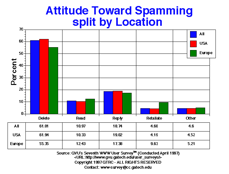 - How exactly do people deal with unsolicited mass emailings (a.k.a. SPAM)? Out of those users who report receiving mass emailings, the most popular response to being spammed is to simply delete the message (61.01%). Nearly one in five users (18.74%) respond to the entities behind the email requesting to be removed from future mailings. Only 10.97% report actually reading the message (up slightly from the Sixth survey of 9.88%), a number which may suprise those entities that send the messages. Close to 5% of the people claim to retaliate in one form or another (mail bombs, denial-of-service attacks, etc.), up one percentage point from the Sixth Survey.