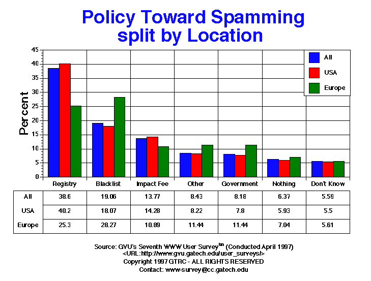 - From this and the Sixth Survey, users make very clear that they do not like to receive mass emailings, i.e., be spammed, but what do they propose to do about it? The most popular solution is an opt-out system where a registry would contain the addresses of people who do not wish to receive mass emailings (38.60%). This is similar to the system already in place in the US that exists to remove people from junk postal mailing lists. 13.77% responded in support of imposing an 'impact' fee on the agencies sending the mail. Exactly what this impact fee would be or how it would be implemented was not specified in the question. Somewhat surprisingly, only 8.18% voted in favor of government regulation making spamming illegal. These findings suggest that the online community favors the co-existence of users and spammers, but with users having more control.