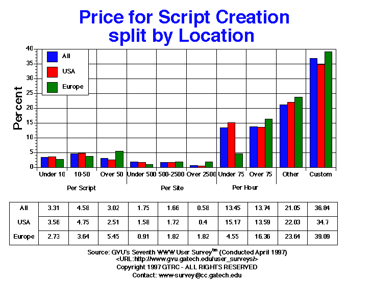 - As with page creation, the largest category of respondents report using custom pricing schemes (36.8%). 10.9% charge per script, 4.0% charge per site, and 27.2% charge by the hour.