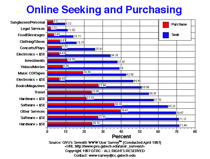 - Using the web for seeking information about products continues to grow. Over 70% of respondents report using the web for seeking information about hardware and software over $50 compared to 66% in the Sixth survey. Respondents are more likely to seek information on more expensive products (over $50) but most choose to buy offline. The most popular item to purchase over the web is software under $50 with 36.2% having done this. Other than hardware and software, the two most popular items to seek information on and to purchase over the web are travel arrangements and books or magazines.