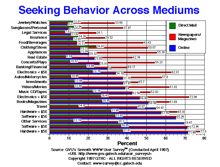 - Newspapers and magazines are where most respondents turn when they are seeking information for an upcoming purchase. When it comes to hardware and software, however, online information seeking has almost reached the same popularity as newspapers and magazines. In almost all cases, online information seeking is used more often than direct mail (one notable exception is clothing/shoes). For travel information, online sources are used more than any other.