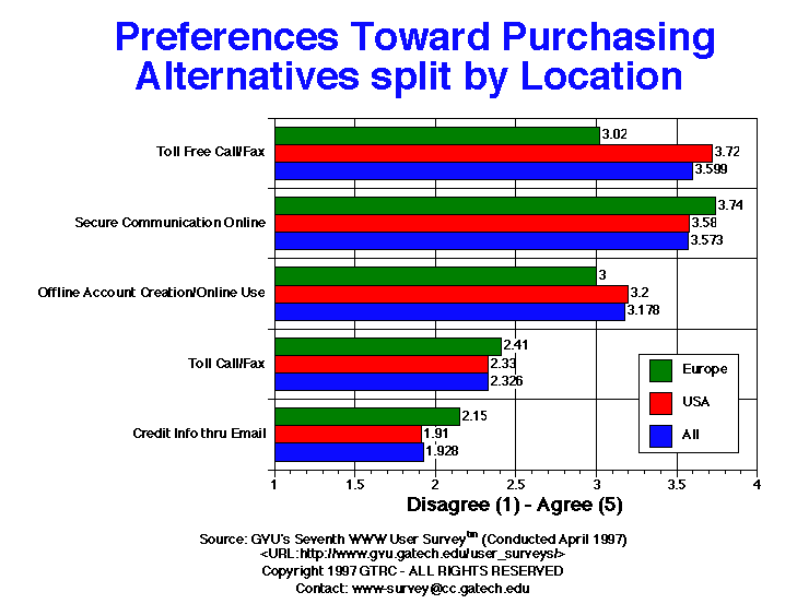 - The most popular methods of making purchases over the web are through a toll-free call/fax and through secure online communications (both 3.6 on a 5-point scale). This is consistent with the Sixth survey where there was still a slight difference between the two with toll-free call/fax being preferred. Users are still wary of providing credit card information through email (1.9). European respondents prefer an online transaction to a toll-free call. Men also seem to be more comfortable with online transactions than women (3.8 male, 3.0 females).