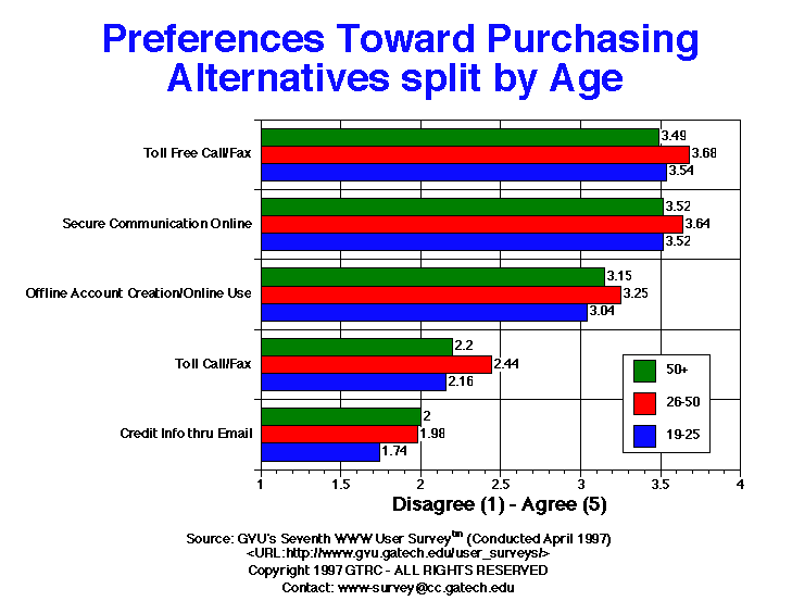 - This question asked users to state their agreement(5)/disagreement(1) on a 5 point scale about providing credit card information through the Web. The slow trend toward increased acceptance of the web as a purchasing medium continues. In the Fourth survey, people agreed fairly strongly that having to provide credit card information over the web was a main reason they didn't buy through the web (3.6). This dropped to 3.4 in the Sixth survey and to 3.2 in the most recent survey. Women are much more cautious than men when it comes to providing credit card information and still agree that giving it out over the web is just plain foolish (3.6 women, 2.9 men). Older respondents are also more cautious. Dealing with a well-known vendor, lower prices, and better services are all factors that might persuade younger respondents to provide credit card information online.