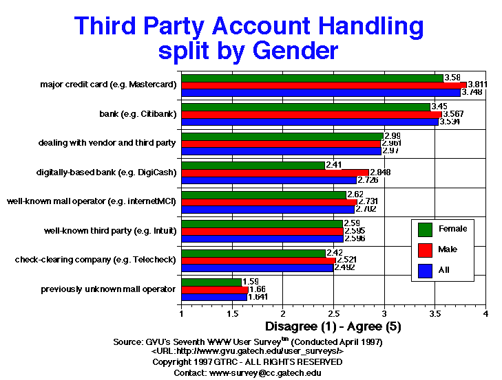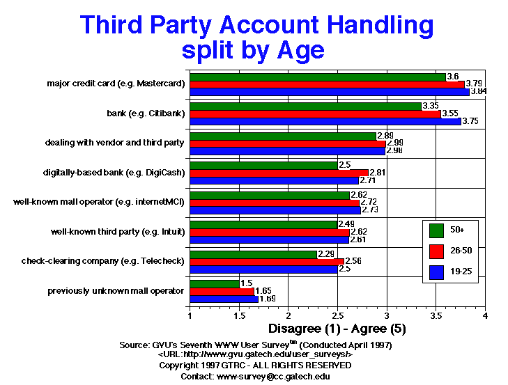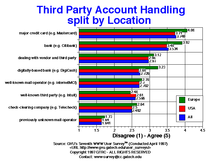 - For this question, users were asked to rate their preference for dealing with different third parties for the set-up of an account that would complete financial transactions with online vendors for purchases made online. The vendors would handle shipments. Higher numbers indicate a greater preference for a third party. Consistent since the Fourth survey, respondents prefer to deal with major credit card companies (4.1) or banks (3.5). European respondents have an even stronger preference for these two kinds of entities, but are also interested in digitally-based banks (3.2 Europe, 2.7 US). All groups of respondents are uncomfortable dealing with previously unknown mall operators (1.6). Males are more inclined to deal with digitally-based banks than females (2.8 males, 2.4 females). Younger respondents had more favorable impressions of all of the potential third parties listed than did older respondents.