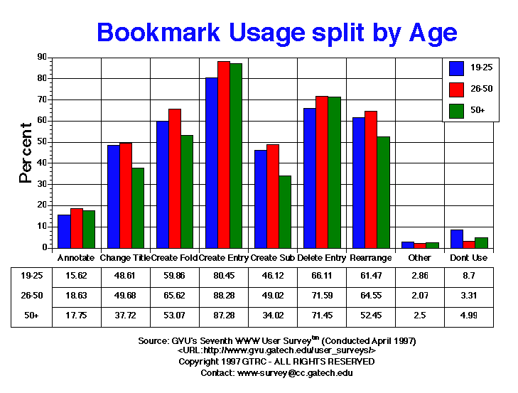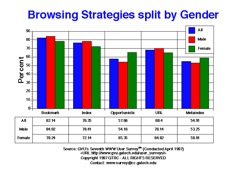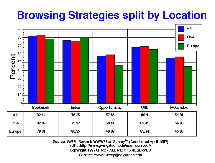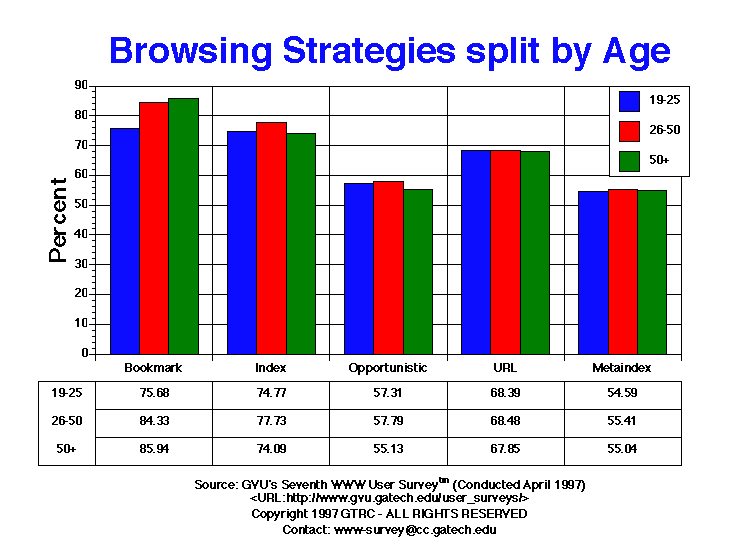 - For this question, users were asked what strategies they use when browsing the Web. Favorite/Bookmark (users revisiting pages they have added to their favorite/bookmark), Index (using search engines such as Lycos), Meta-index (using large indices such as Yahoo), Opportunistic (following links from page to page as they are encountered), and URL (typing in known URLs). For this question, users were allowed to mark more than one answer. Once again, all categories had very high percentages. As in the Fourth, Fifth, and Sixth Survey, the highest was Bookmarks (82.14% Seventh vs. 82.69% Sixth), followed by Index (76.35% Seventh vs. 78.1%Sixth) and URL (68.40% Seventh vs. 69.44% Sixth). The percentages for Meta-indices (54.91%), Opportunistic (57.66%) and URL based (68.40%) strategies have dropped somewhat since the Sixth and Fifth Survey. As with the Sixth Survey, younger users are less likely to use bookmarks (75.68% 19-25 vs. 85.94% 50+), though differences for other strategies across age are not significant.