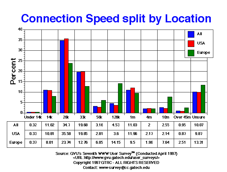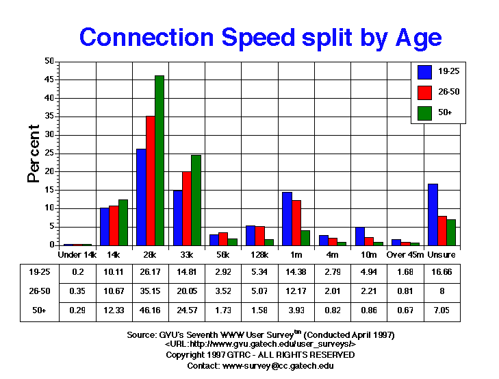 - European respondents, in general, have faster connection speeds. Nearly three fourths (70.73%) of the 50+ yr. old group uses28.8 Kb/sec or 33.3Kb/sec modems. Also, a higher percentage of respondents between 19 and 25 years old are unsure of their connection speed (16.24%), though those that do know, report fast speeds, most likely due to educational infrastructures of over 1 Mb/sec. These differences across strata are basically identical to the Sixth and Fifth Surveys indicating relative stability in this characteristic.