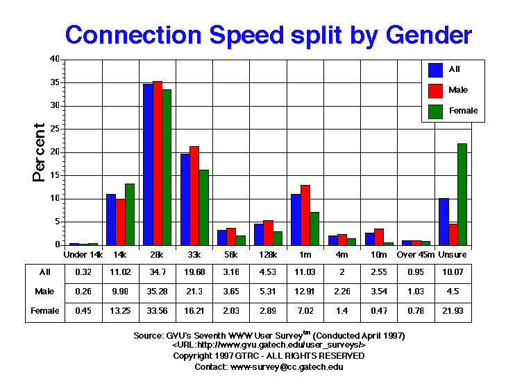 - Modems still dominate the day for Web users. One third of the users report using 28.8 Kb/sec modems, with 19.68% using 33.3 Kb/sec, and 11.02% using 14.4 Kb/sec modems. This is a big change for the Sixth Survey sixth months ago where just over half of the users (51.40%) were using 28.8 Kb/sec modems and 19.69% were using 14.4 Kb/sec modems. As once might expect, this represents a continued significant shift towards faster communication devices.