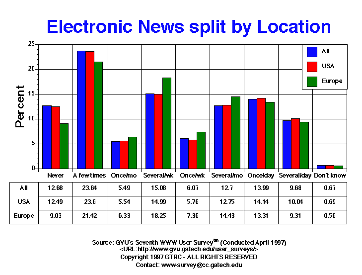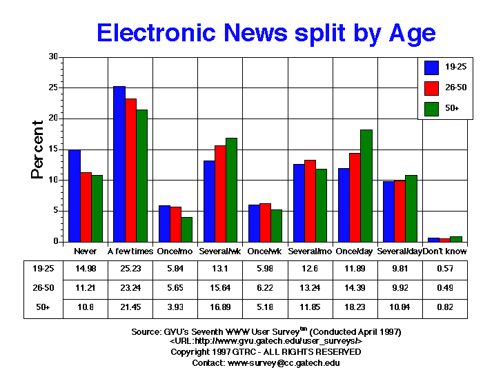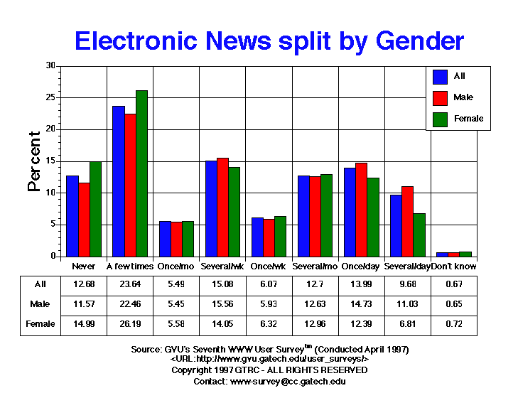 - An increase occurred in the frequency of people accessing electronic news on a daily biases (23.76% Seventh vs. 18.95% Sixth), resulting in nearly one in four users accesses electronic news on a daily basis. The number of users accessing on a weekly basis though has remained about the same (21.05% Seventh vs. 22.94% Sixth vs. 22.1% Fifth) along with the number of respondents who have never accessed electronic news (12.68% vs. 14.15% Sixth vs. 13.9% Fifth). Females, in general, seem to access electronic news less frequently than males. As reflected in studies of news consumption in other mediums, e.g., television and newspapers, the younger generation consumes less news and on a more infrequent basis. This trend is reflected in online newspapers as well where 51.14% of 50+ yr. olds access electronic news at least weekly compared to only 40.14% of the 19-25 yr. olds. Both groups though show an increase in consumption of electronic news from the Sixth Survey where 41.07% 50+ yr. olds and 31.14% 19-25 yr. olds consumed news on at least a weekly basis.