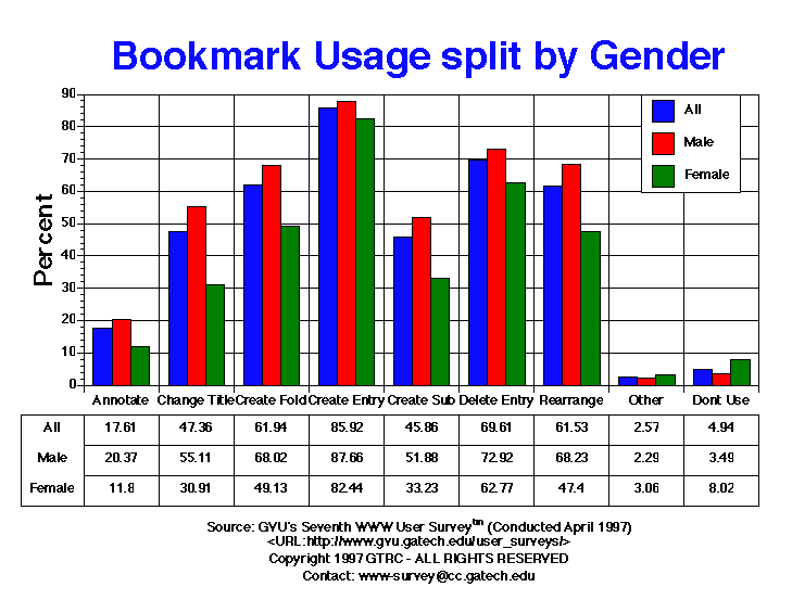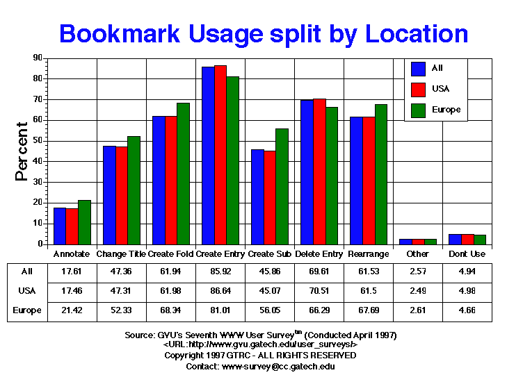 - As one might expect with the slight increase in the number of bookmarks/favorites being stored by users since the Sixth Survey, users in the Seventh Survey report minor increases in overall bookmark usage behaviors. As with the Sixth Survey, nearly all users (85.92%) create new entries, with 69.61% deleting entries and 61.53% rearranging entries. More than half of the users (61.94%) create folders, with 45.86% creating sub-folders (folders within folders). A fair number of users change the titles of their entries (47.36%) though not may users annotate entries (17.61%). Only 4.94% claim not to use this facility of the browser.