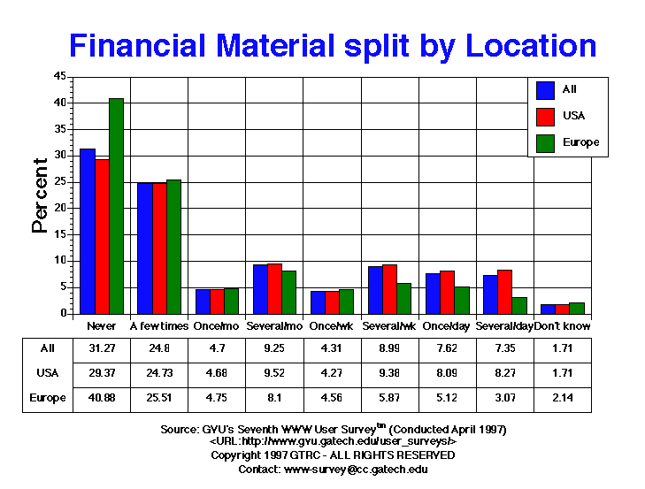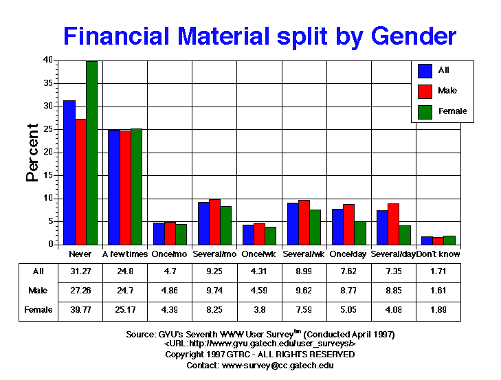 - Just under a third of respondents (31.27%) reported that they never use the Web to find economic information, continuing a trend of more users experiencing online financial data (33.89% Sixth vs. 38.0% Fifth had never accessed financial data online). Part of this increase was in daily users, where 14.97% of the users currently access this information compared to 11.78% Sixth Survey and 8.96% in the Fifth Survey. More females than males report never having used the Web for economic information (39.77% female vs. 27.26% male), which is noticeably less than the Sixth Survey (42.98% female vs. 29.82%) and Fifth Survey (49.9% females, 32.6% males).