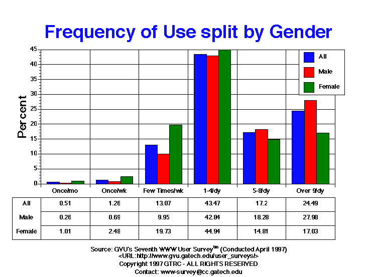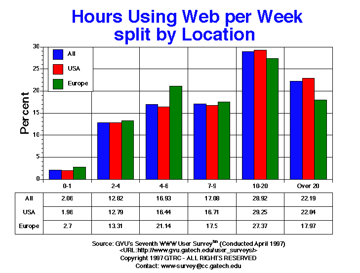 - While the number of times browsers are used per day has increased since the last survey, the number of hours people user the Web has remain about the same, with just over one in five users (22.19%) reporting using their browsers over 20 hours per week. 28.92% of the users spend 10 to 20 hours a week on the Web, with 17.08% spending 7 to 9 hrs/wk and 14.84% spending 4 to 6 hrs per week. Casual use of less than 5 hours per week is down from 16.87% in the Fifth Survey and 15.18% in the Sixth to 14.88% in the Seventh, further emphasizing the trend towards increased usage. For comparison, in the Third Survey conducted in April of 1995, only 28.46% of the users spent more than 10 hrs/wk on the Web. Twenty-four months later, nearly twice as many users (51.1%) spend more than 10 hrs/wk! Females, older users, and US users are more likely to spend less time on the Web than their counterparts. The average number of hours per week user spend on the Web is 13.6, which is slightly more than the 9.1 hours/week reported by FIND/SVP's 1997 American Internet User Survey, thus reflecting a bias in our sample towards heavier users of the Web. This makes sense given that only those users that use the Web regularly are likely to participate in our surveys.