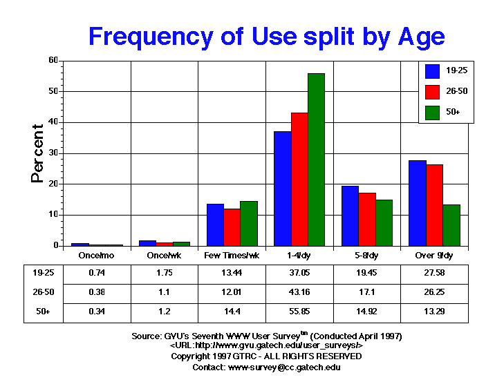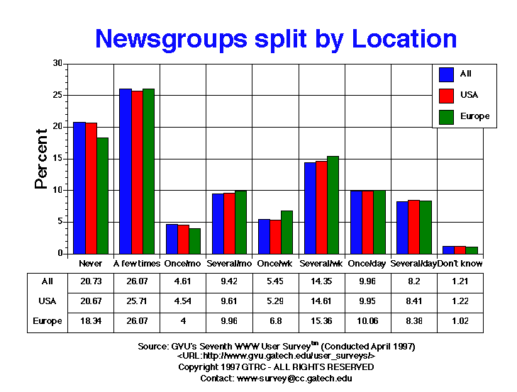 - There has been an increase in the use of newsgroups since the Sixth Survey six months ago. Over one third of the users (37.96% Seventh vs. 32.81% Sixth) access Usenet Newsgroups at least weekly, with 46.80% (46.1% Sixth) either having never access newsgroups of only accessed them a few times. Females and the 19 - 25 yr. old group tend to access newsgroups less frequency than their counterparts.