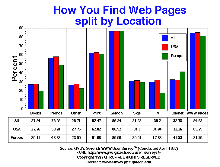 - For this question, users were allowed to mark more than one answer. The primary method people find out about other sites is via search engines (86.34% Seventh vs. 87.71% Sixth) and other Web pages (84.63% vs. 86.92% Sixth). This continues the reversal from the Fifth Survey, where 90.7% reported finding out about Web pages from other Web pages and 83.1% from search engines. Printed media (62.47% Seventh vs. 67.95% Sixth), friends (56.92% Seventh vs. 56.66% Sixth), TV (30.20% Seventh vs. 35.54% Sixth), email signatures (31.23% Seventh vs. 30.01% Sixth), and Usenet Newsgroups (32.75% Seventh vs. 34.25% Sixth) remain other popular methods for finding out about other pages. The use of Usenet has declined 12 percentage points from the Fifth Survey (44.4%). As with the Sixth Survey, the younger generation is more likely to find out about other pages from friends, while the older generation make more use of printed media.