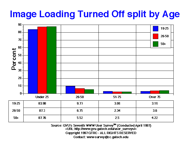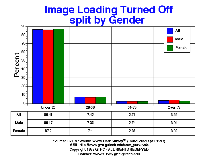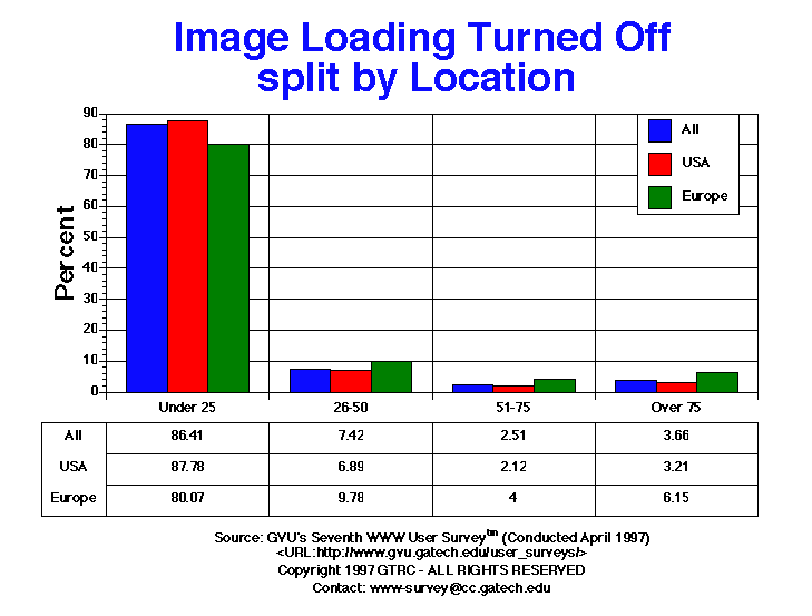 - This is a relatively new question to the Surveys (started in the Sixth Survey), but one that we've been meaning to ask for quite some time due to the numerous queries we field about how often people surf without images being loaded for each page automatically. This is a big concern for graphic designers who are faced with the opposing goals of producing media rich content that everyone can access quickly. As with the Sixth Survey, most people surf with images loaded automatically as (86.41% Seventh vs. 85.40% Sixth) report turning image loading off under 25% of the time. The remaining 13.59% report not loading image anywhere from 26 to 100% of the time. As one might expect due to the slow transoceanic connection between US and Europe, more Europeans turn image loading off. Differences between gender were not observed, though younger users are more likely to have image loading turned off.