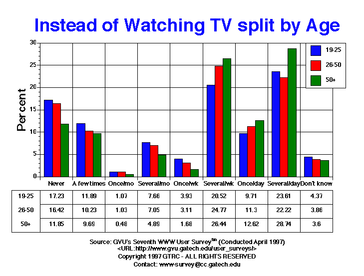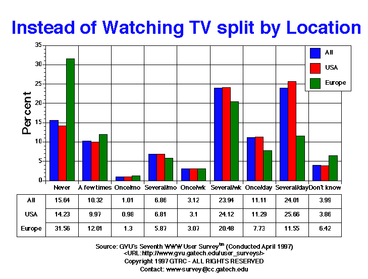 - Over one third (35.17% Seventh vs. 36.95% Sixth) of respondents claim that they use the Web instead of watching TV on a daily basis. An additional (27.06% Seventh vs. 29.03% Sixth) say the Web replaces TV on a weekly basis, usually more than once a week. This pattern almost exactly matches the pattern found in the Sixth and Fifth Surveys. These number when used in conjunction with the use of the email as being on equal par with the phone paint a tremendously strong picture of the rapid integration of the Internet and World Wide Web into the fabric of the lives of those who currently use it. This is truly an amazing feat to accomplish in only a few years! Respondents from Europe are far less likely to use the Web instead of watching TV; 31.56% (32.88% Sixth) say they have never used the Web instead of watching TV. Males and 50+ yr. olds supplement TV watching with Web surfing more so than the other segments of users.