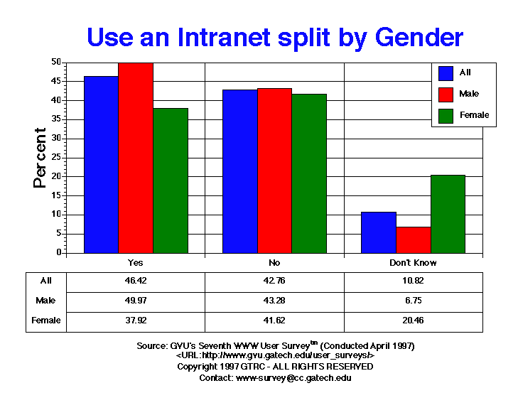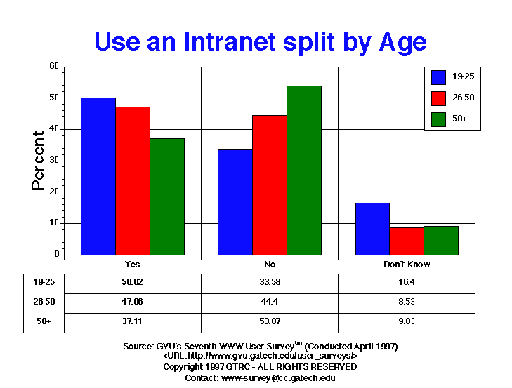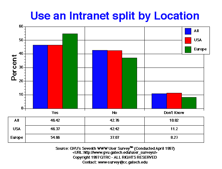- Of those user who belong to a commercial, educational, or miscellaneous organization, 46.42% claim that their organization has an Intranet. European users have a higher incidence rate of Intranet use (54.66%) vs. their US counterparts (46.37%). Many female and 50+ yr. old users found the question not applicable.