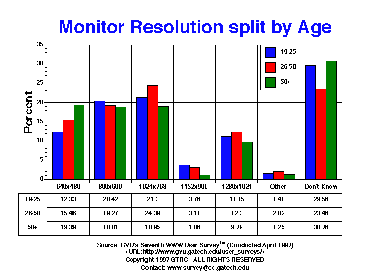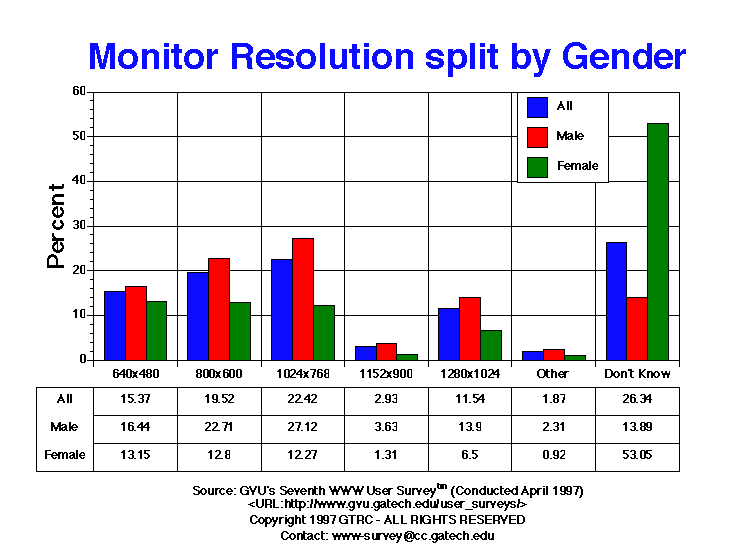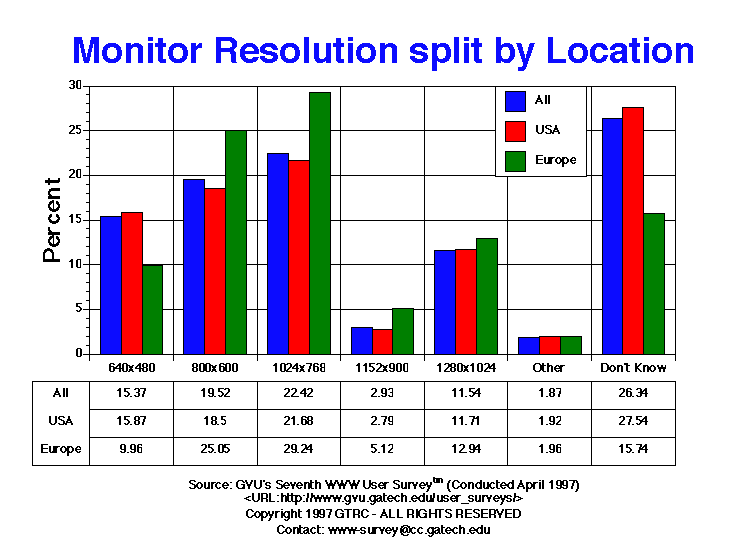 - To complete the picture so to speak (puns are a terrible thing to waste!), knowledge of the resolution of monitors is also necessary. Again, a fair number of users were unsure as to what their monitor characteristics are (26.34% Seventh vs. 26.95% Sixth). The remaining users report having 1024 x 768 resolution (22.42% Seventh vs. 22.21% Sixth), 800 x 600 resolution (19.52% Seventh vs. 17.67% Sixth) and 640 x 480 (15.37% Seventh vs. 19.95% Sixth). Europeans , males and users age 26-50 were more likely to known the characteristics of their monitors.