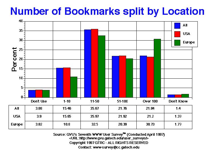 - As in the Fifth and Fourth Surveys, more European respondents than US respondents had over 100 items in their favorites (30.73% Europe vs. 21.20% US). In general, females have fewer items than males, The respondents with the highest number of items in their favorites/bookmarks are users in the 26-50 yr. age range (Seventh: 47.17, Sixth: 44.59%) have over 51 items in their list.