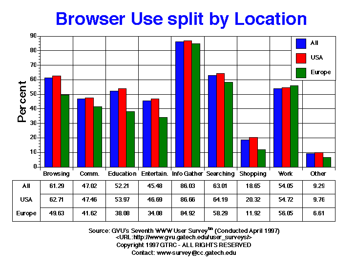 - The most common Web activity is to gather information (86.03%), followed by searching (63.01), browsing (61.29%), work (54.05%), education (52.21%), communication (47.02%), and entertainment (45.48%). Shopping remained stable (18.65%) from the Sixth Survey (18.83%), though this is much higher than the Fifth Survey a year ago where 14.91% reported shopping (11.1% in the Fourth Survey). For the US, one in five users report using the Web for shopping (20.32%). This represents a moderate and steady growth of the Web for shopping, a trend that is expected to continue, as online transactions become easier and more choices become available. Europeans tend to report less recreational uses of the Web than do US users.