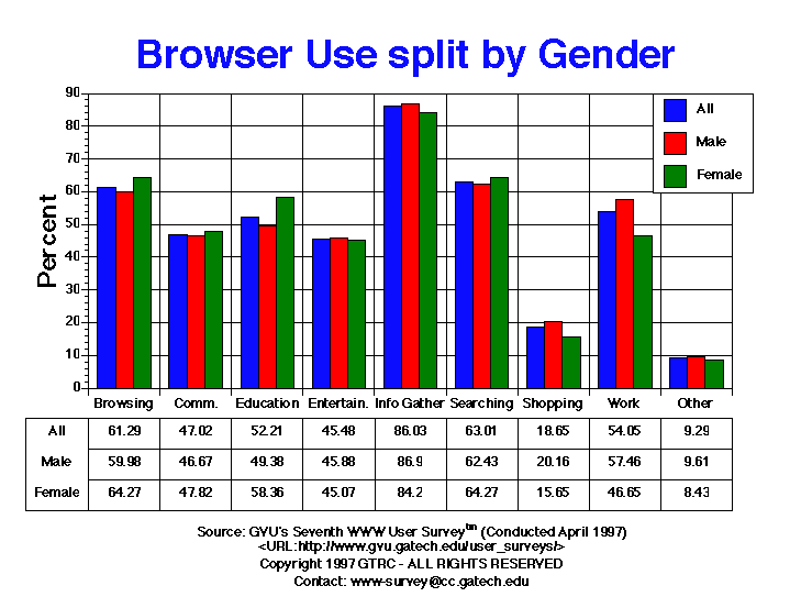 - As with the Fifth Survey, males reported slightly more work-related uses of the Web: work (53.18%) and business research (44.61%) while females reported more educational uses (58.46%). Also mirroring the findings of the Fifth Survey, the 26-50 age group reported significantly more work (58.11%) and business research (47.99%) being done on the Web than other age groups. Those aged 19-25 report more entertainment uses (75.85%) and academic research (51.18%).