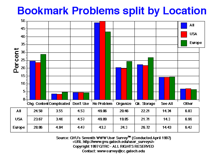 - Speed continues to be the number one problem facing Web users, with 66.31% of the users reporting that it takes too long to download pages. However, this represents a 10% decrease from the Sixth Survey (76.55) and a 14% decrease from the Fifth Survey one year ago. This effect is most likely due the increases in connect speed of users to the Internet (See: Connection Speed). Almost half of the users report broken links as a big problem (49.90%), a situation with no immediate solution. The next big problems are "finding known info" (30.31% Seventh vs. 34.09% Sixth), organizing collected information (27.80% Seventh vs. 31.03% Sixth), and being able to find pages already visited (12.16% Seventh vs. 13.41% Sixth). Once again, cost does not seem to be an issue, with only 5.41% (7.75% Sixth) reporting this as a problem. Given that the average household income of Web users is well above the normal population, this is not very surprising and cannot be taken to mean that the Web is currently affordable for all. Males are more likely to complain about speed and organizing information while females are more likely to cite broken links and finding known information as the biggest problems.